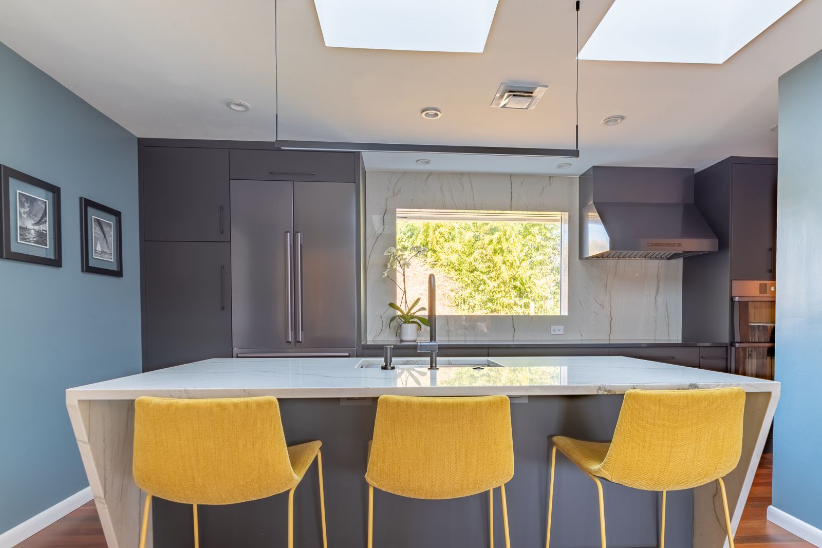 The Transitional kitchen style, which is most popular today, combines rich traditional features with sleek and clean lines of contemporary design elements.   Traditional kitchens tend to have many decorative accents, while modern designs tend to be simple. Transitional kitchens mix both looks for a visual balance. This includes simple cabinetry, as with shaker style cabinetry, and natural materials of marble, quartz, and granite. Transitional kitchens typically have an open concept, making a kitchen island a common feature.  Islands are sometimes matched to the color of the wall cabinets or sometimes painted an accent color for contrast.